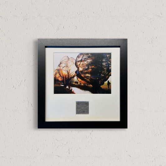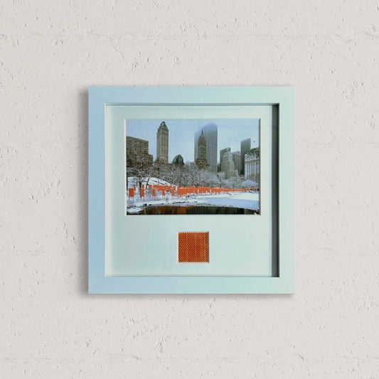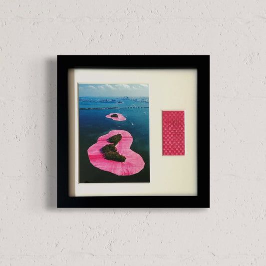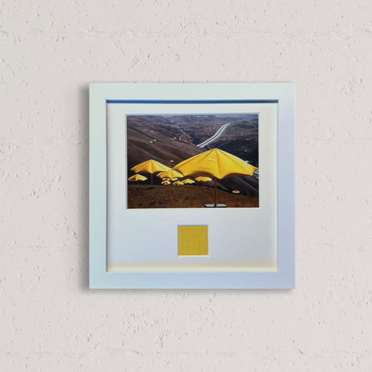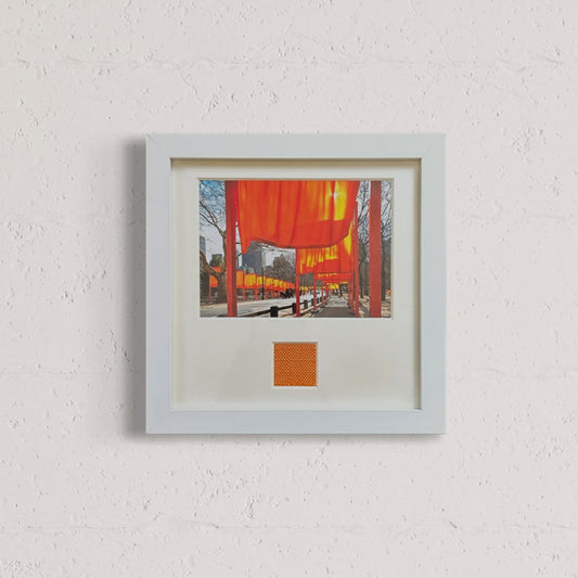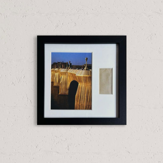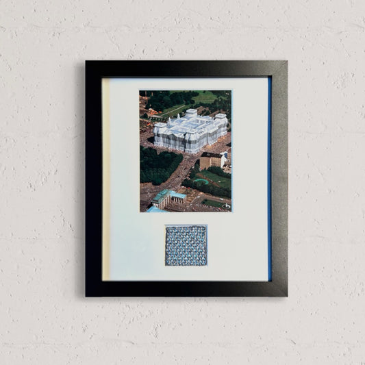 Erwerben Sie ein exklusives Stück Kunstgeschichte mit unseren einzigartigen Collagen: Authentische Stoffstücke aus verschiedenen monumentalen Verhüllungsaktionen von Christo und Jeanne-Claude kombiniert mit einem kleinen Offsetdruck. Jedes Kunstwerk wird stilvoll in einem Rahmen präsentiert.