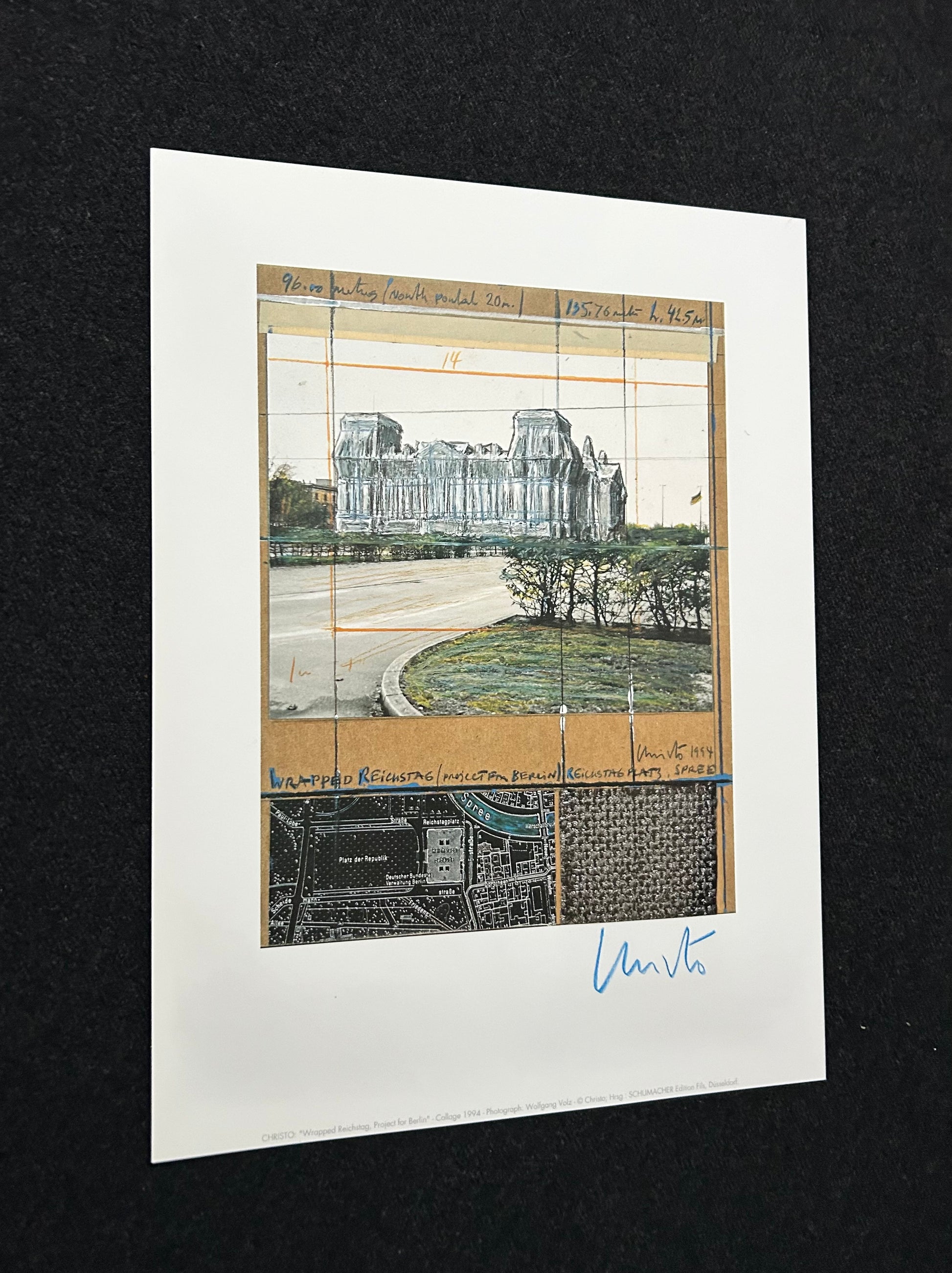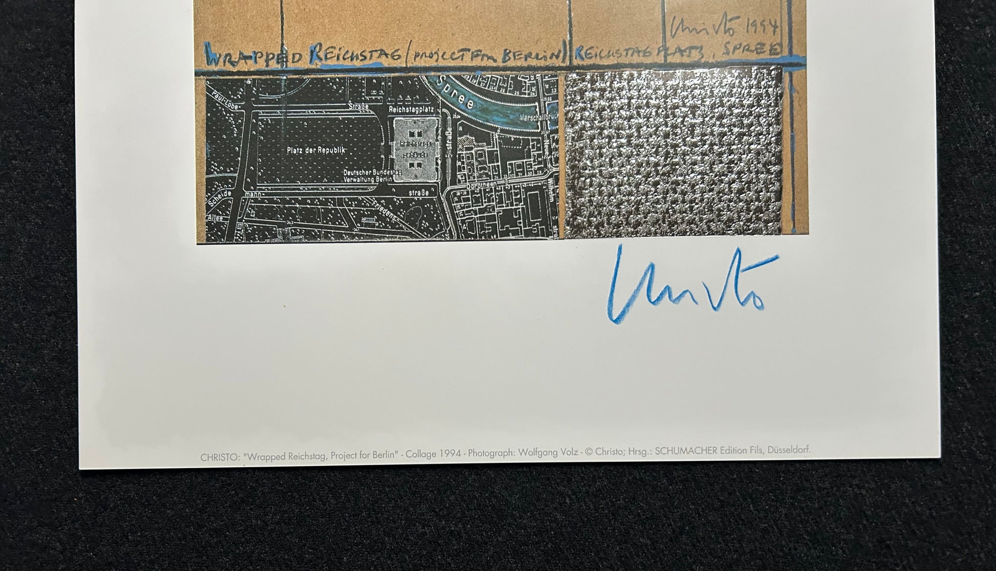 seltene Farboffset-Lithographie der Reichstagsverhüllung von 1994, lizenziert, handsigniert mit blauer Kreide von Christo, Blattgröße: 40,0 x 30,0 cm, Collage mit Silberfolie