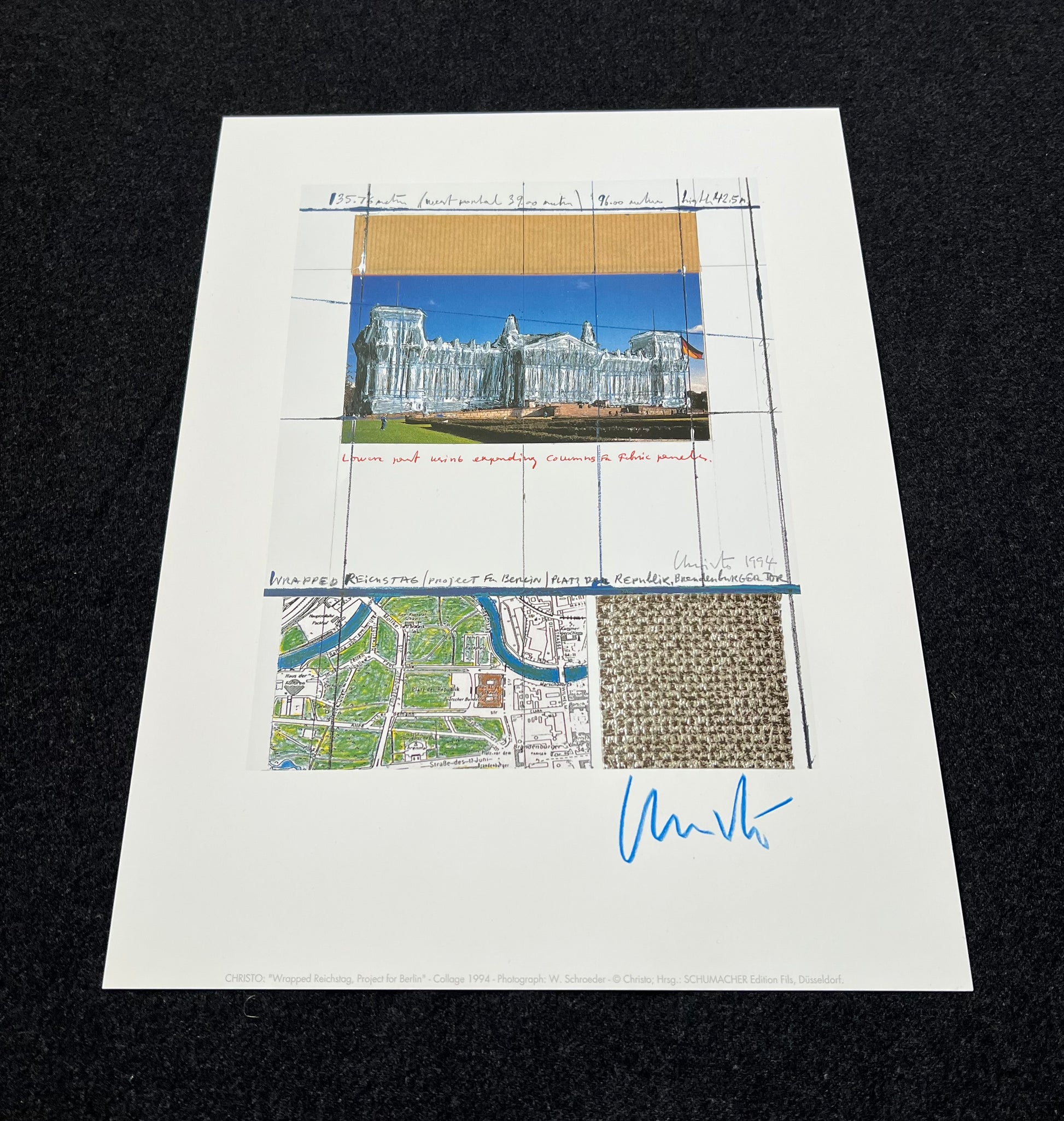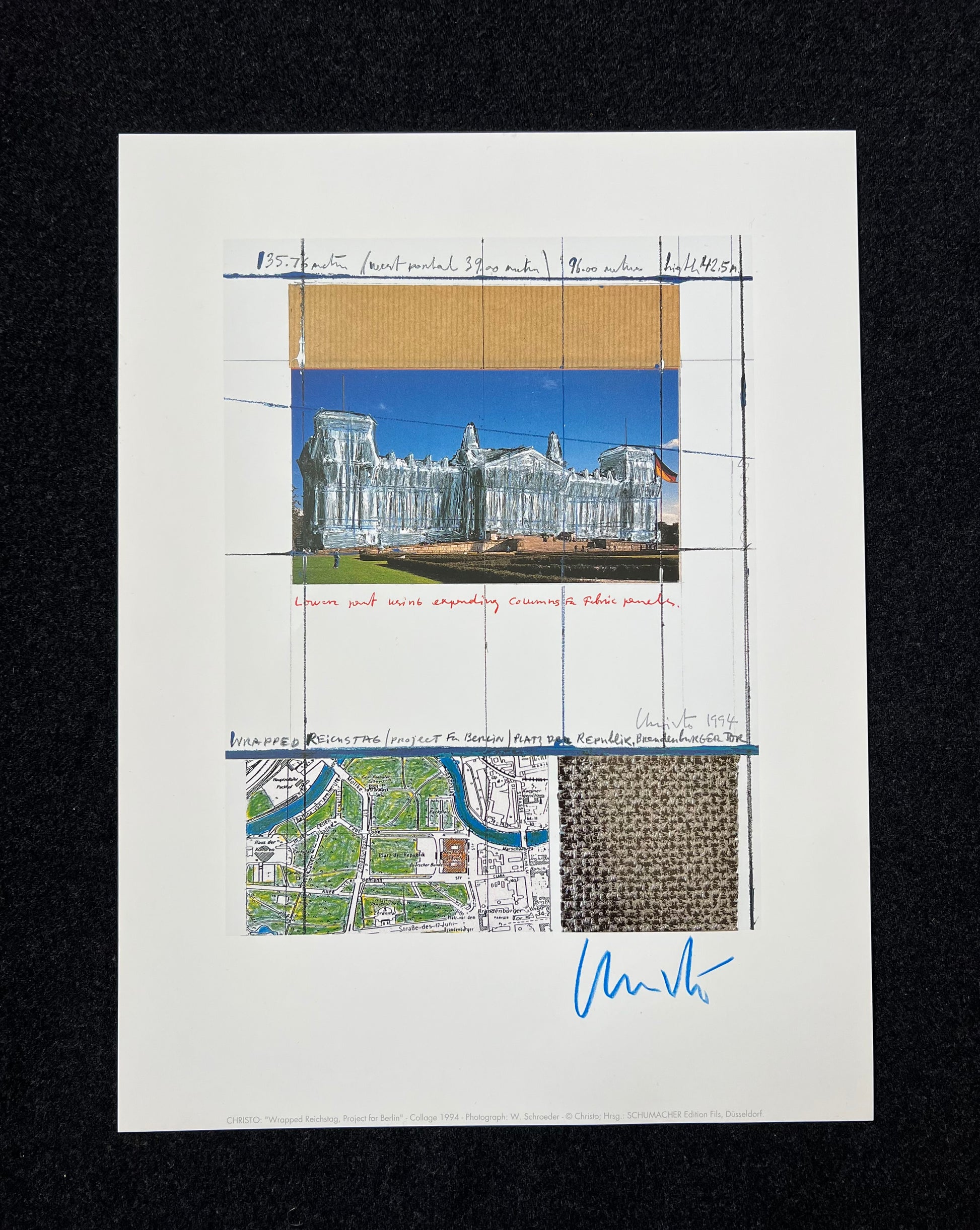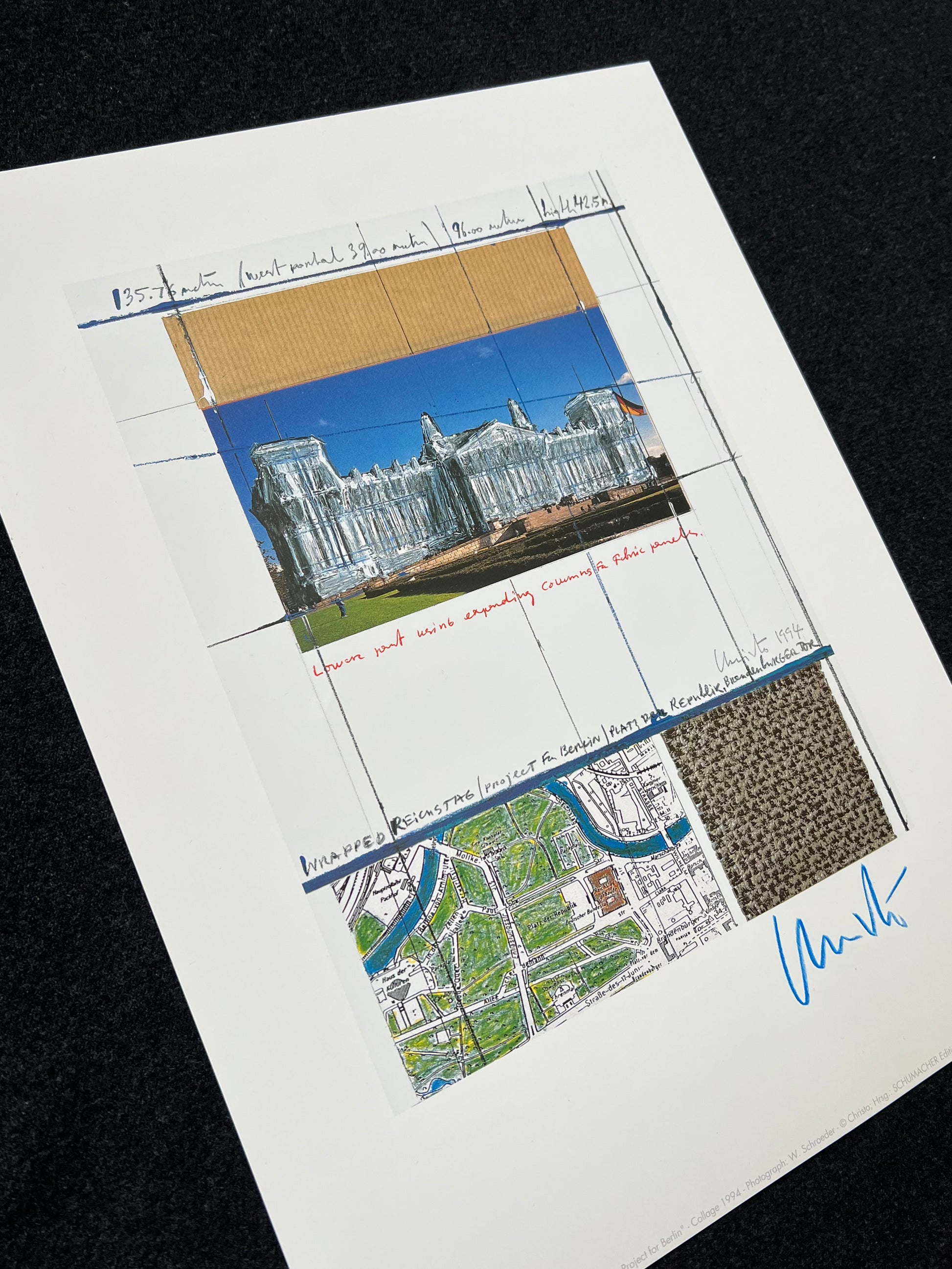 seltene Farboffset-Lithographie der Reichstagsverhüllung von 1994, lizenziert, handsigniert mit blauer Kreide von Christo, Blattgröße: 40,0 x 30,0 cm, Collage mit Silberfolie