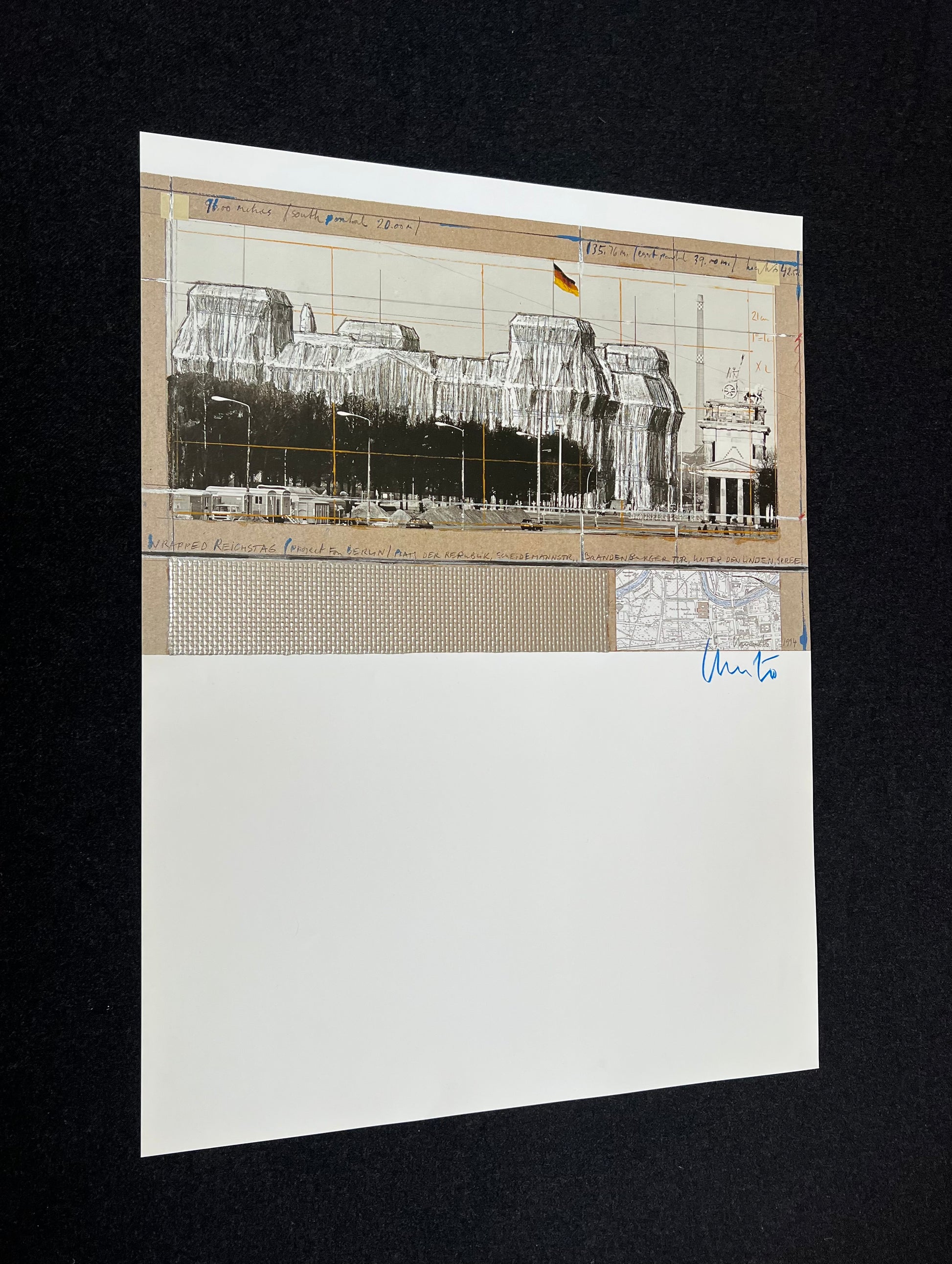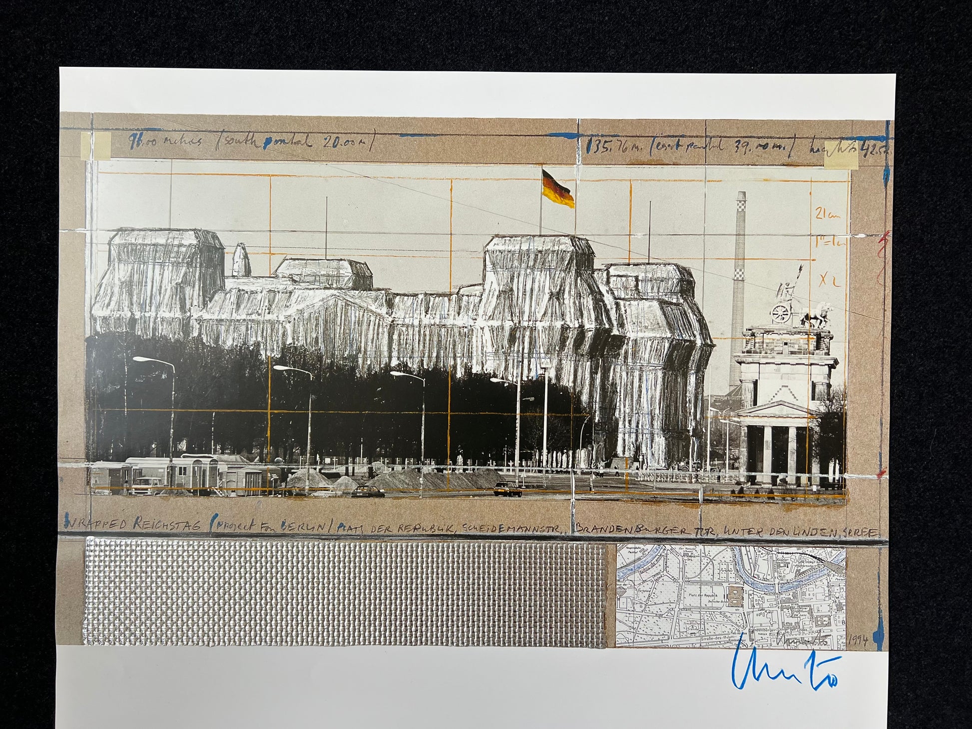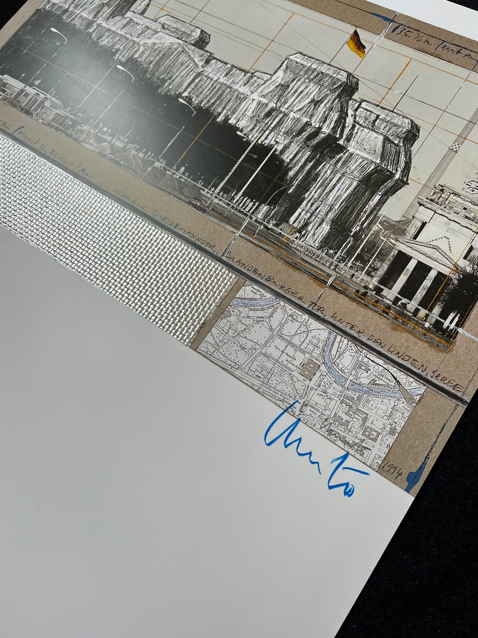 seltene Farboffset-Lithographie der Reichstagsverhüllung von 1994, lizenziert, handsigniert mit blauer Kreide von Christo, Blattgröße: 58,0 x 75,0 cm, Collage mit Silberfolie