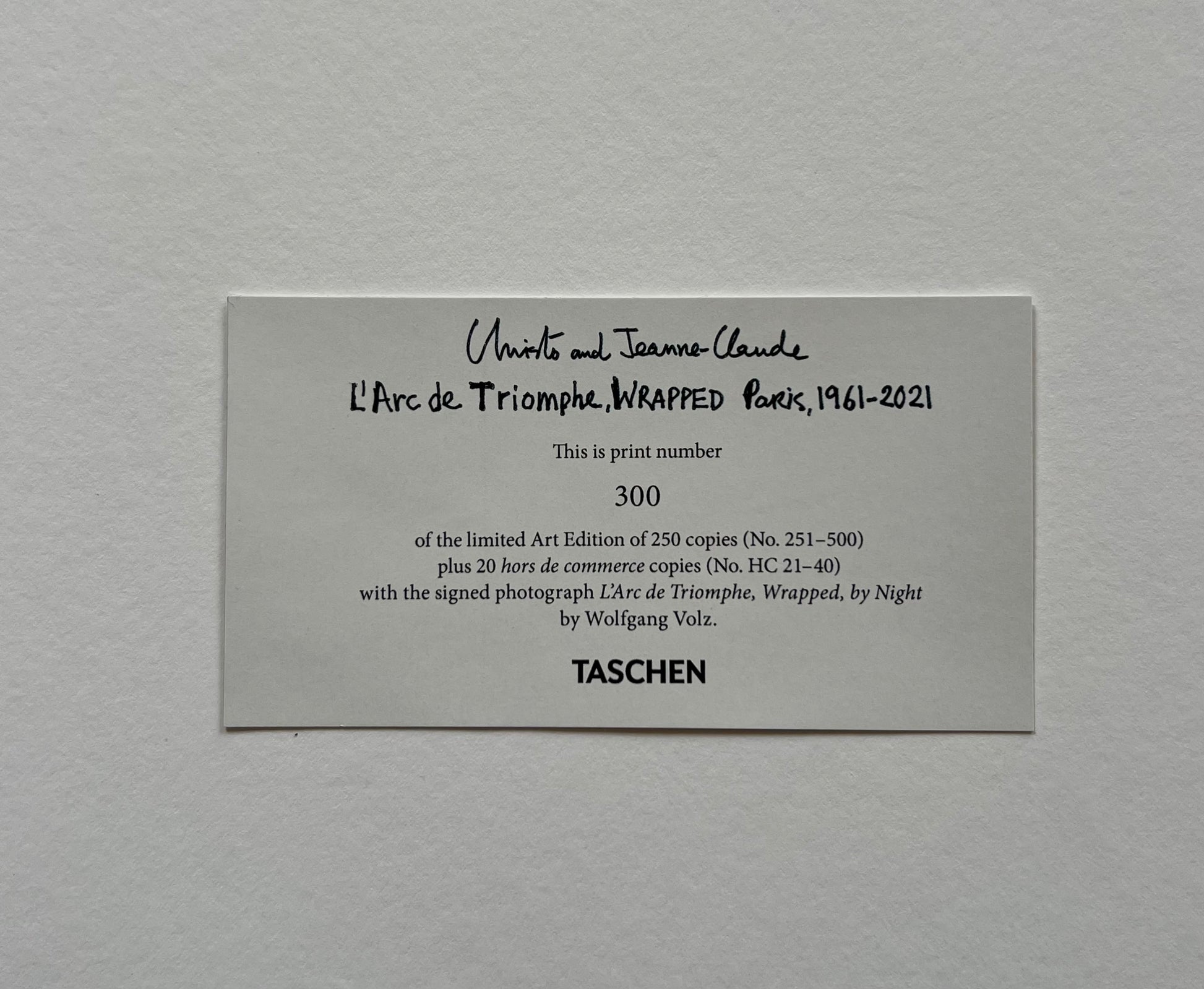 Limitierte Art Edition (No. 251-500) mit dem nummerieten Print L’Arc de Triomphe, Wrapped by Night, 2021, signiert von Projektfotograf Wolfgang Volz.