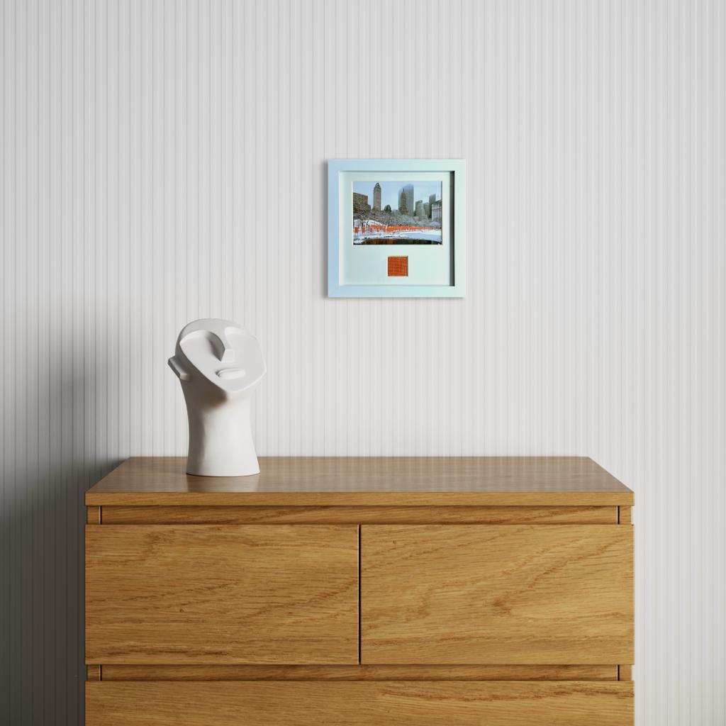 kleiner Offsetdruck von Christo auf Fotokarton mit original Stofffetzen zum Projekt in hochwertiger Rahmung mit Echtglaseinlage, Datierung: 2005 (2021), lizensiert, Herausgeber: Taschenverlag Köln, Blattgröße: 18,0 x 13,5 cm, Rahmengröße: 24,0 x 24,0 x 2,0 cm