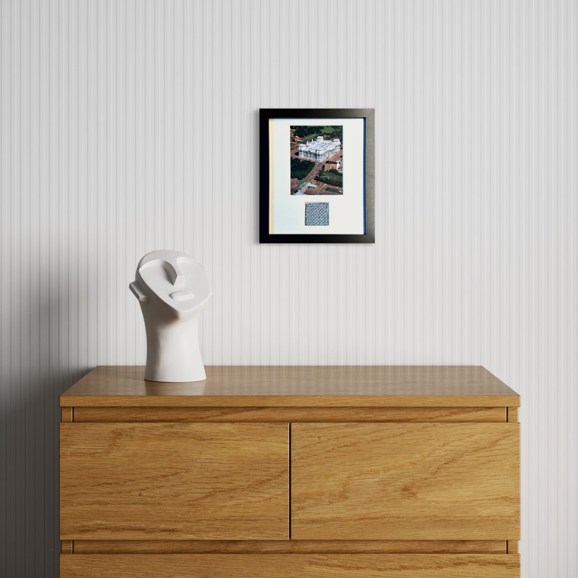 kleiner Offsetdruck von Christo auf Fotokarton mit original Stofffetzen zum Projekt in hochwertiger Rahmung mit Echtglaseinlage, Datierung: 1995 (2021), lizensiert, Herausgeber: Taschenverlag Köln, Blattgröße: 18,0 x 13,5 cm, Rahmengröße: 24,0 x 28,0 x 2,0 cm