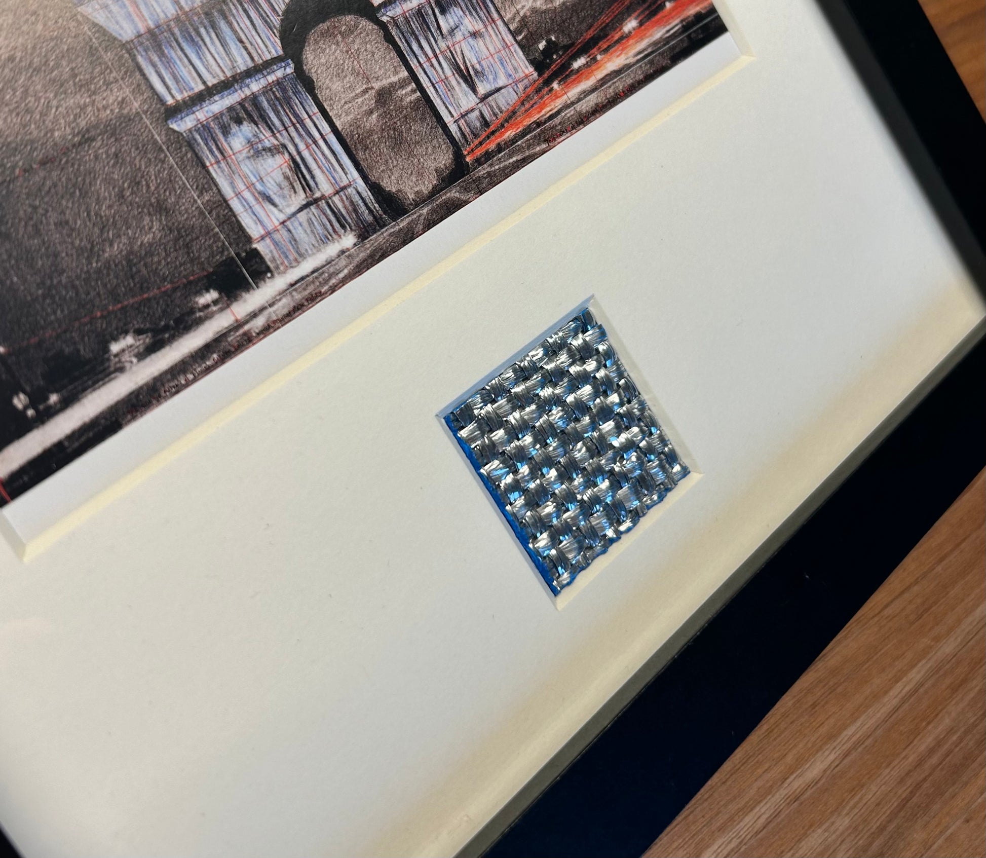 kleiner Offsetdruck von Christo auf Fotokarton mit original Stofffetzen zum Projekt in hochwertiger Rahmung mit Echtglaseinlage, Datierung: 2021, lizensiert, Herausgeber: Taschenverlag Köln, Blattgröße: 18,0 x 13,5 cm, Rahmengröße: 24,0 x 24,0 x 2,0 cm