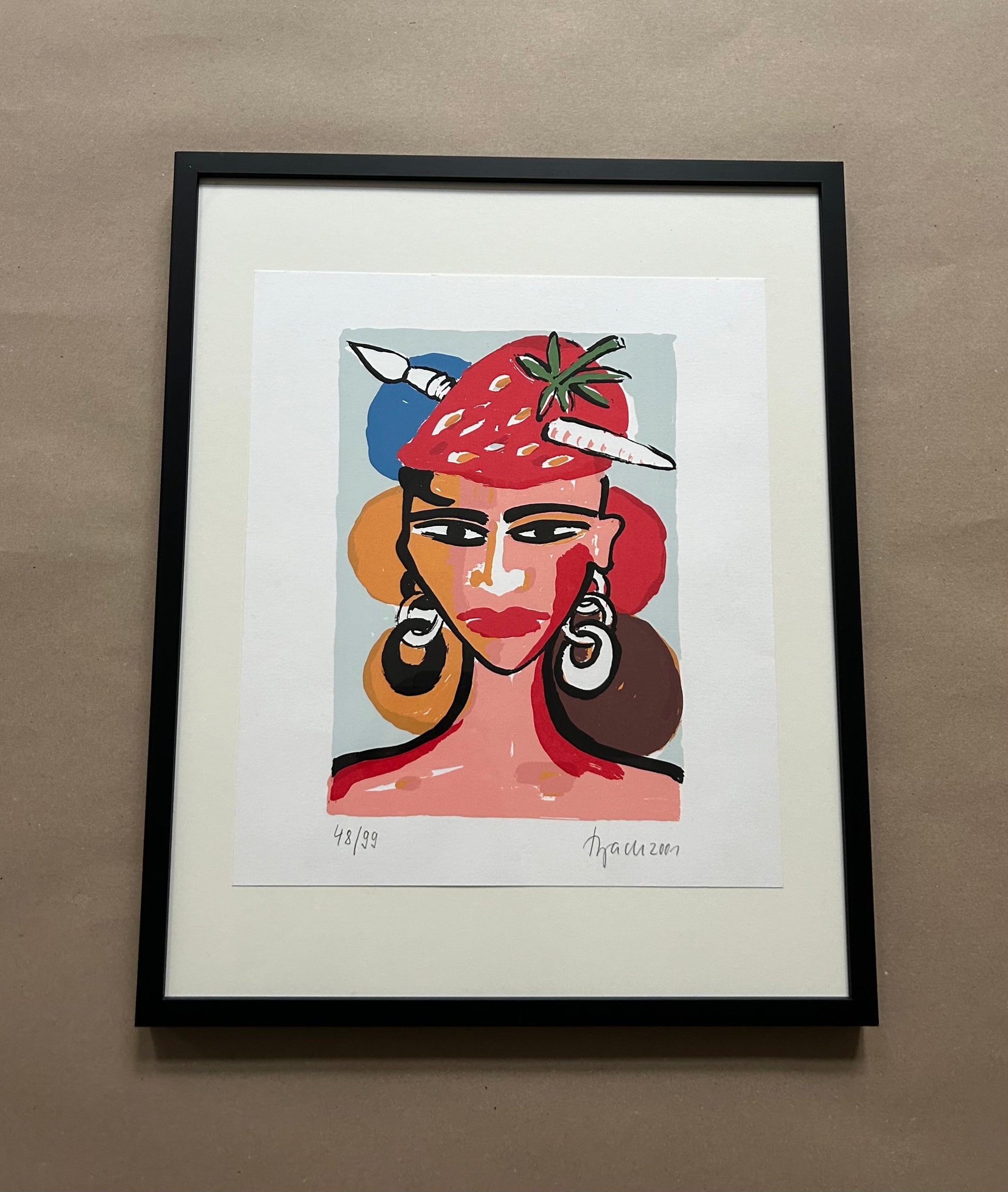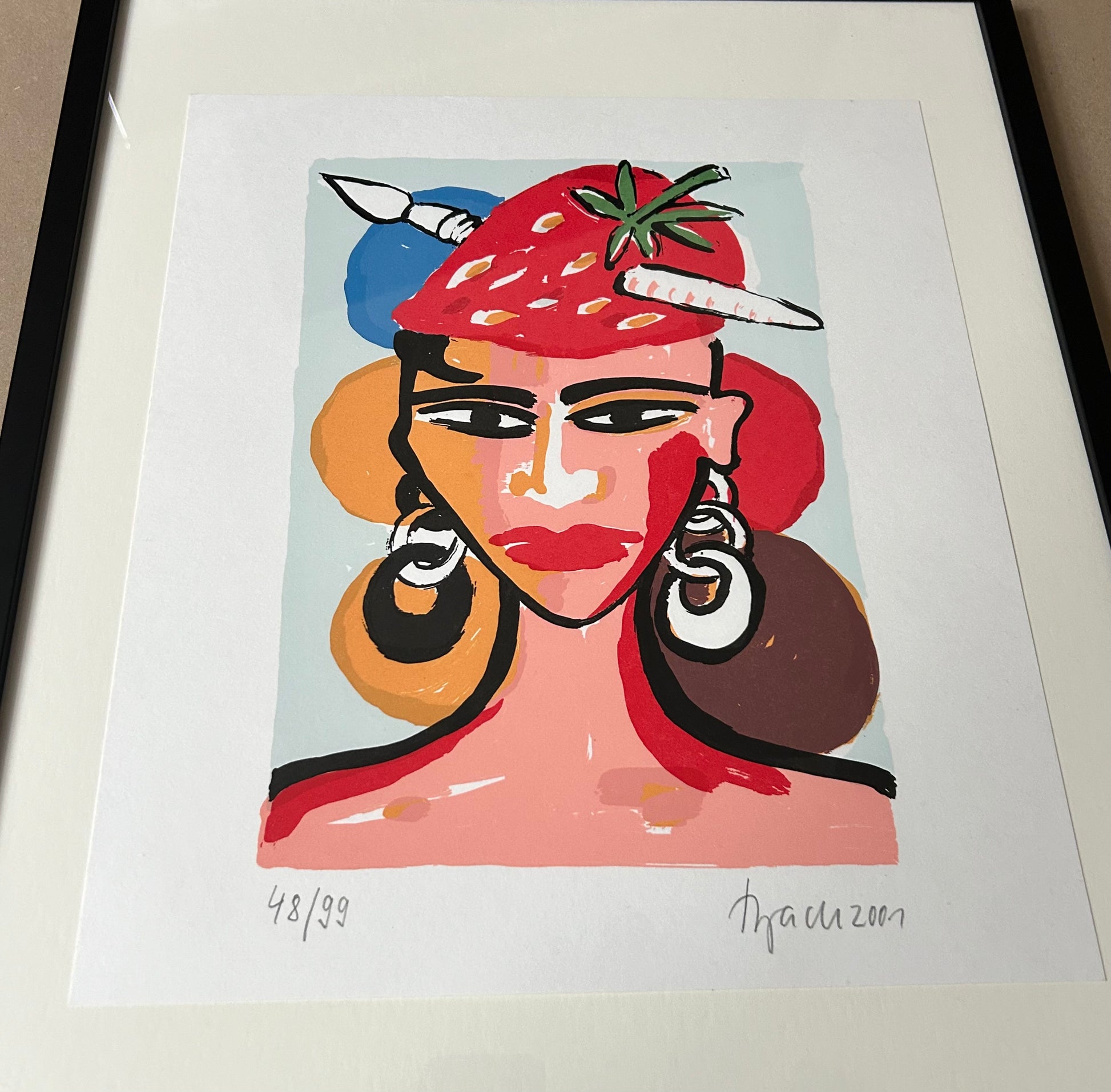 seltene Farblithographie von Elvira Bach auf festem Papier, 2001, limitierte Auflage von 99 nummerierten Exemplaren, hier: Ex.: 48/99, handsigniert (mit Bleistift), in hochwertiger Rahmung, Blattgröße: 32,0 x 37,0 cm, Rahmengröße: 40,0 x 50,0 x 3,0 cm.