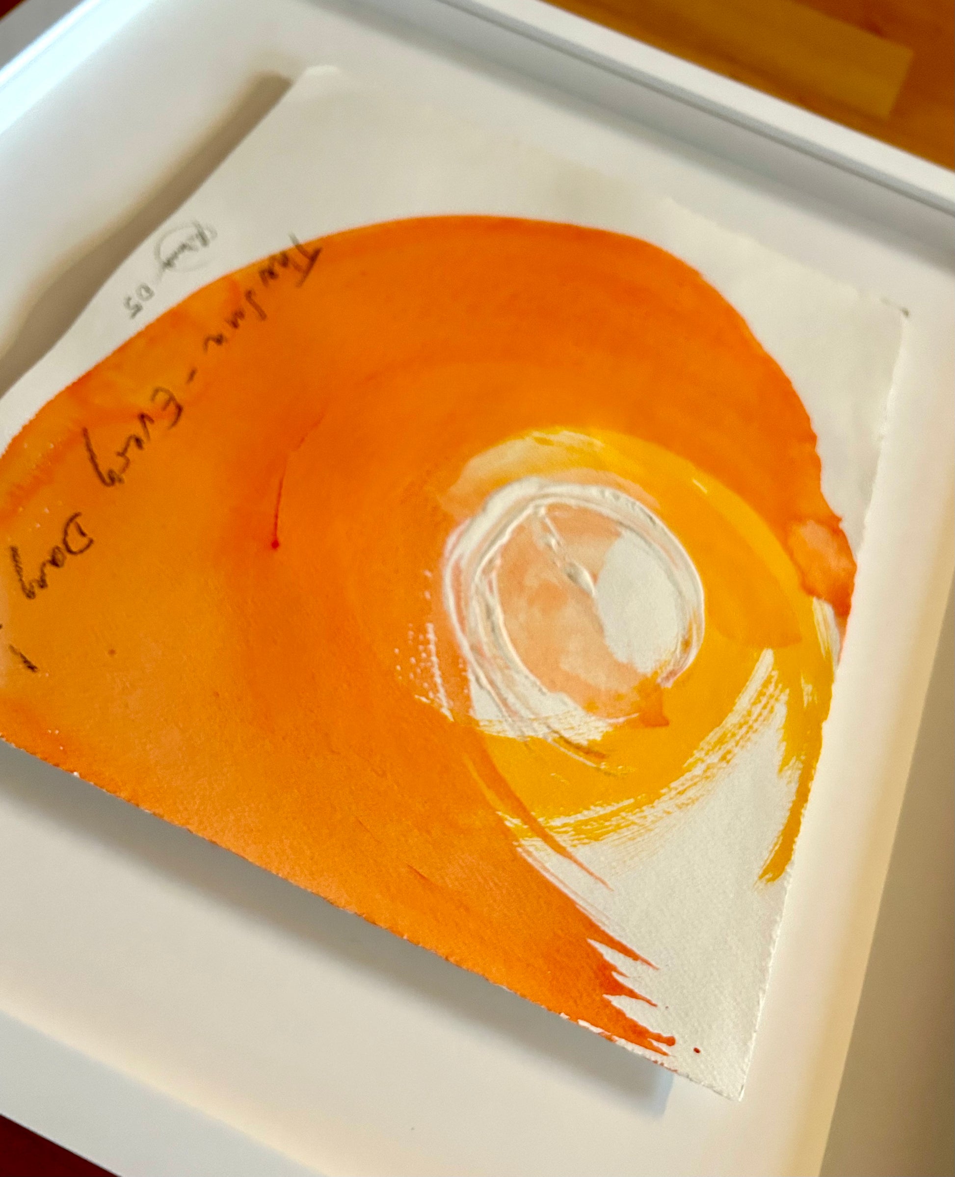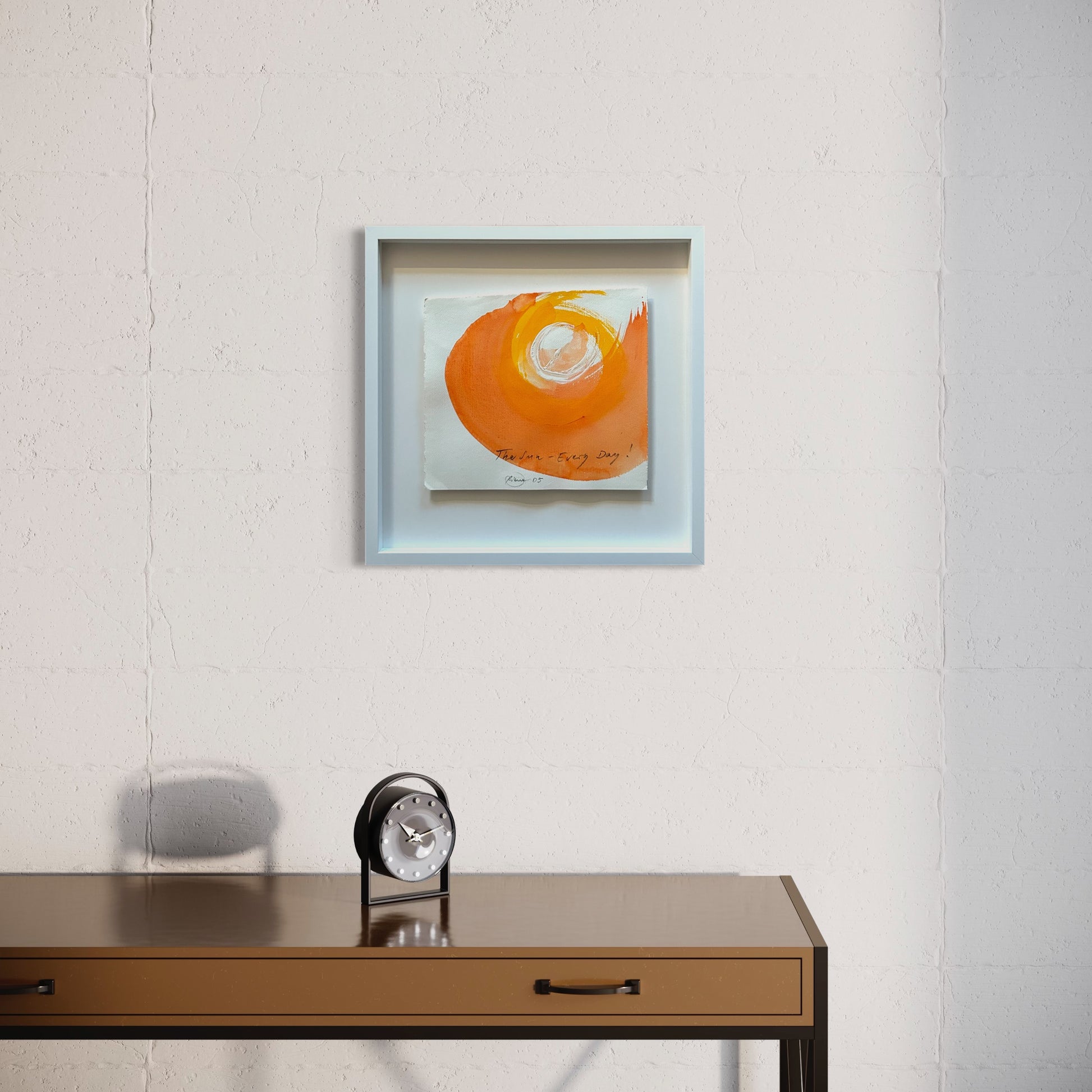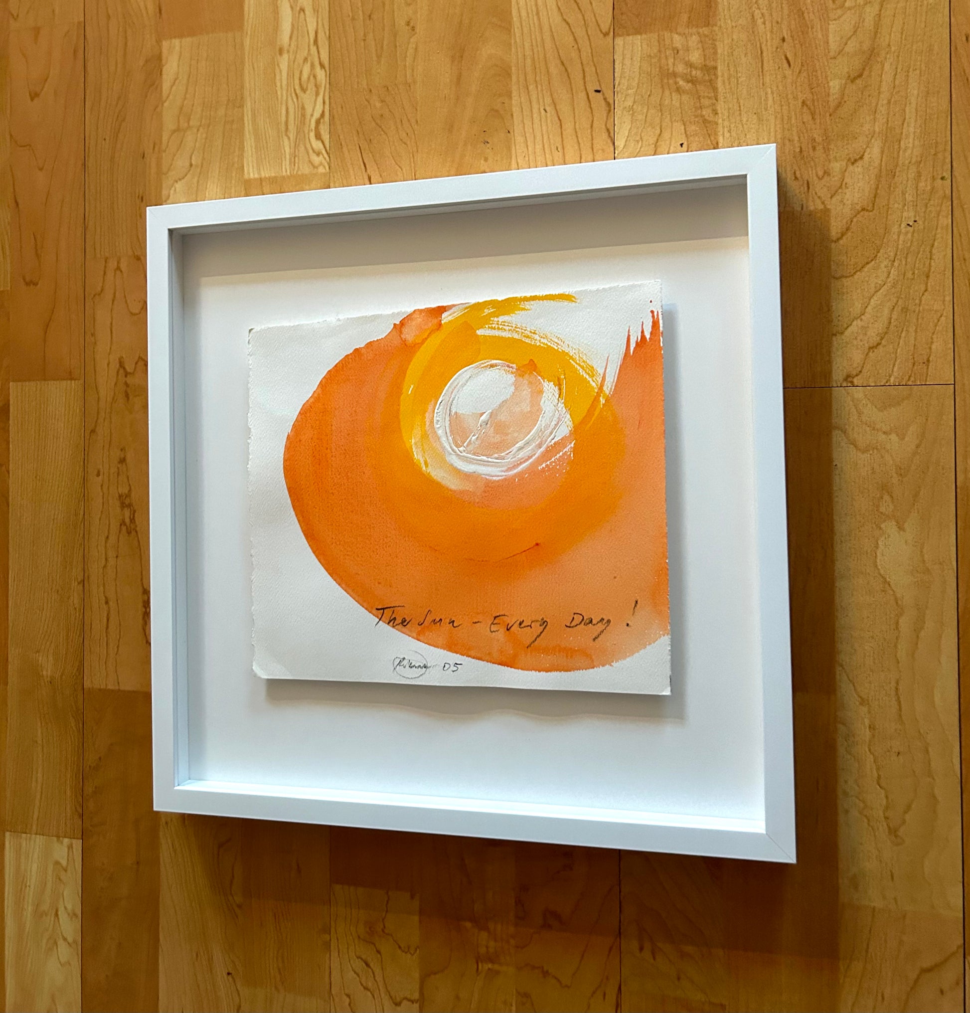 farbenfrohes Unikat von Otto Piene, handsigniert & datiert (mit Bleistift), betitelt: "The Sun - Every Day!", Jahr: 2005, Technik: Acryl auf Leinen, Blattgröße 26,0 x 28,0 cm, Rahmengröße: 42,5 x 42,5 x 3,5 cm, Galerierahmung mit Museumsglas (UV 70%).
