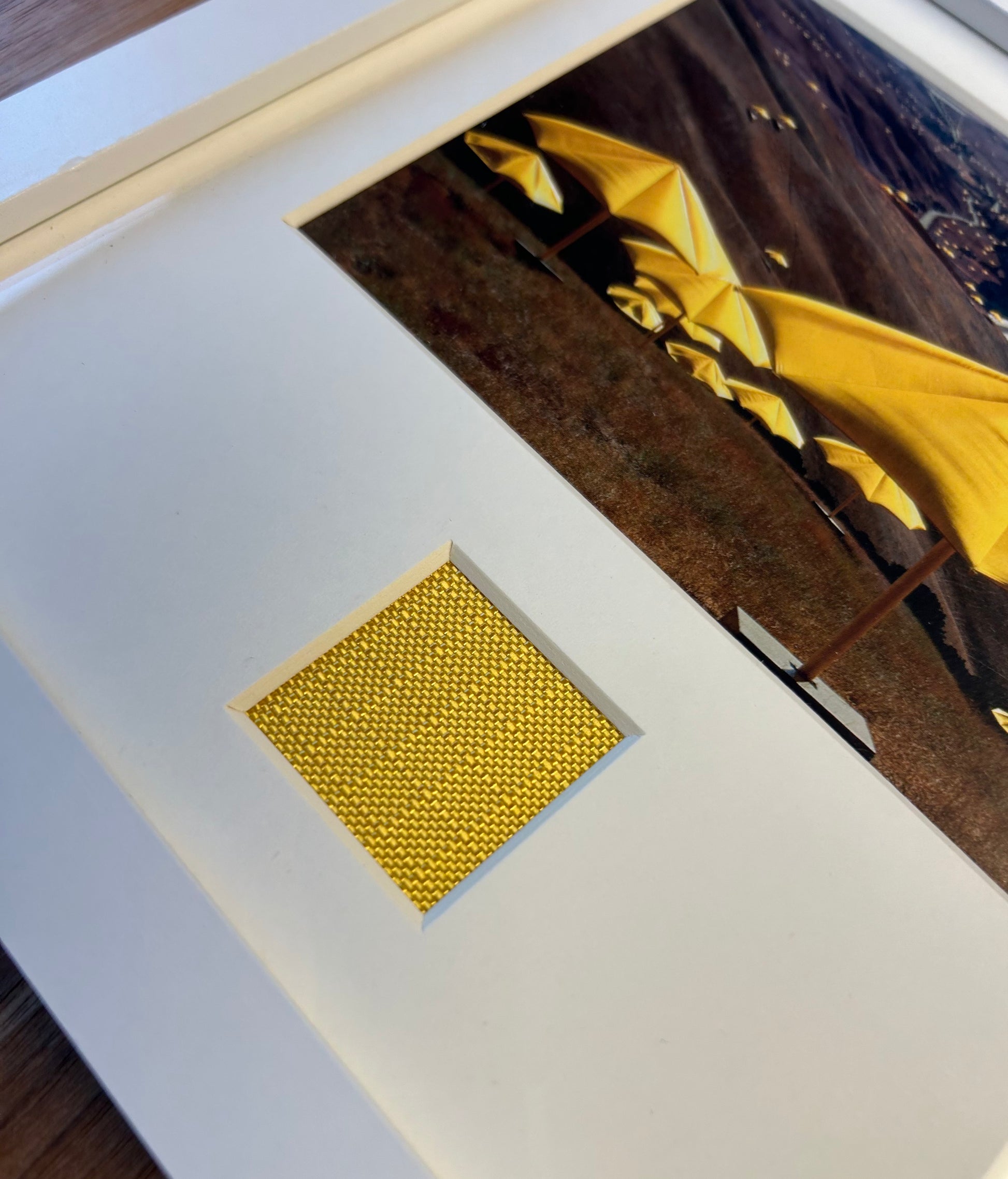 kleiner Offsetdruck von Christo auf Fotokarton mit original Stofffetzen zum Projekt in hochwertiger Rahmung mit Echtglaseinlage, Datierung: 1991 (2021), lizensiert, Herausgeber: Taschenverlag Köln, Blattgröße: 18,0 x 13,5 cm, Rahmengröße: 24,0 x 24,0 x 2,0 cm